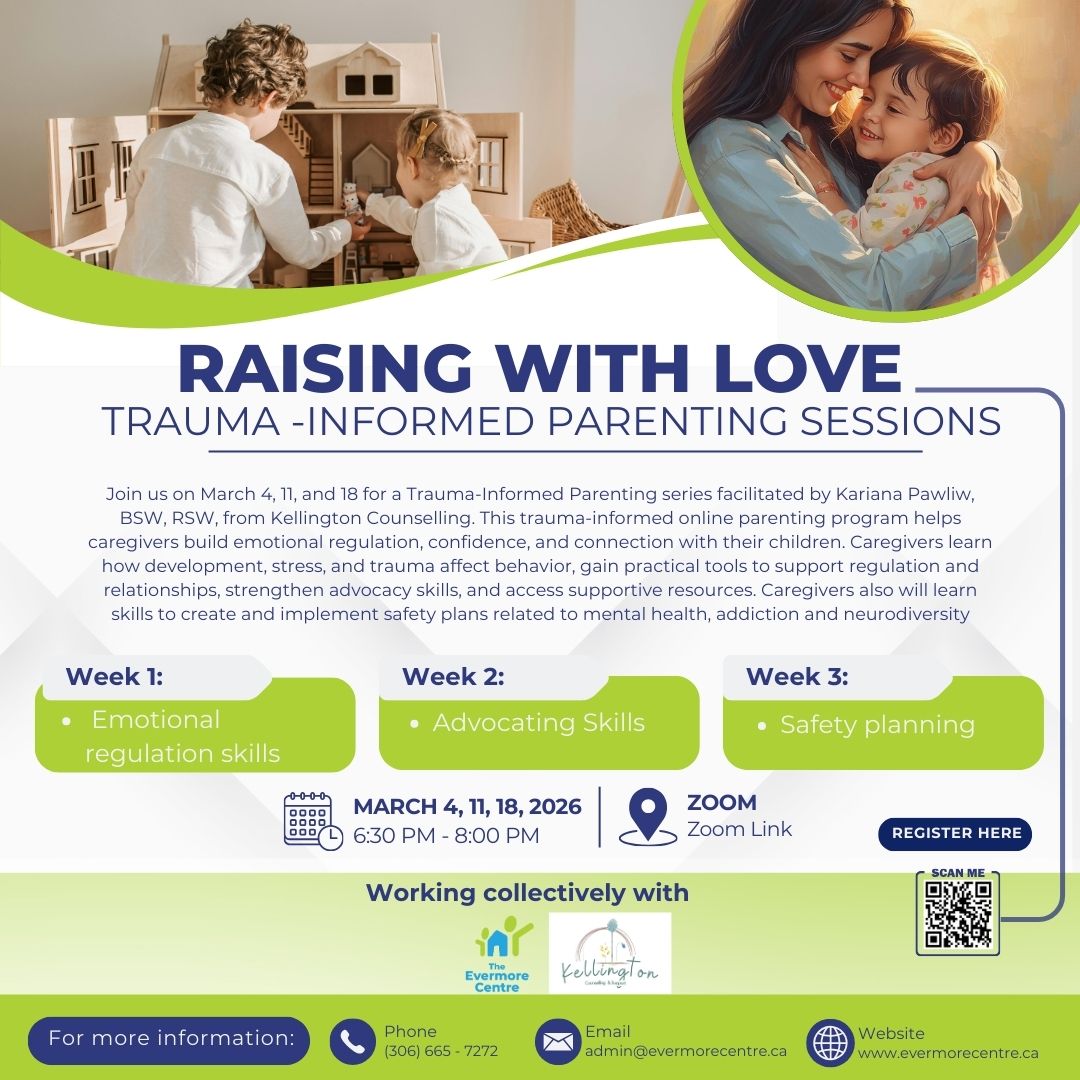 Join us on March 4, 11, and 18, 2026, for Raising with Love, a trauma-informed online parenting series facilitated by Kariana Pawliw, BSW, RSW, fromKellington Counselling. This supportive program is designed to help caregivers build emotional regulation, confidence, and meaningful connection with their children. Participants will explore how child development, stress, and trauma impact behavior, while learning practical emotional-regulation tools, advocacy skills, and ways to strengthen relationships at home and in the community. Caregivers will also engage in safety planning related to mental health, addiction, and neurodiversity.
